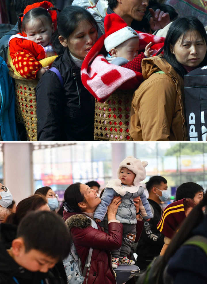上图:2005年1月17日,两名背着孩子的时光旅客在广州火车站排队等待检票进站。新华社记者 刘大伟 摄