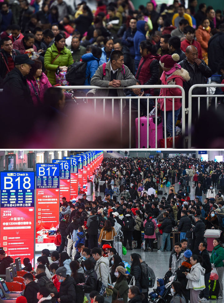 下图:2024年1月26日,旅客在深圳北站排队检票乘车。新华社记者 梁旭 摄