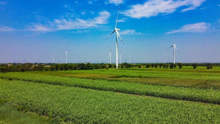 走进小王庄镇李官庄村,连片的农田之间,最显眼的是一台台高耸入云的风力发电机,如同一只只白鸟展开巨大的翅膀,叶片随风缓缓转动。