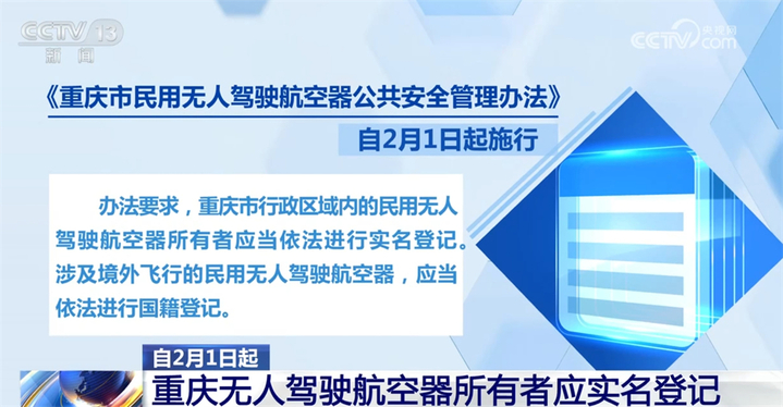 《重庆市民用无人驾驶航空器公共安全管理办法》自2月1日起施行。办法要求,重庆市行政区域内的民用无人驾驶航空器所有者应当依法进行实名登记。涉及境外飞行的民用无人驾驶航空器,应当依法进行国籍登记。