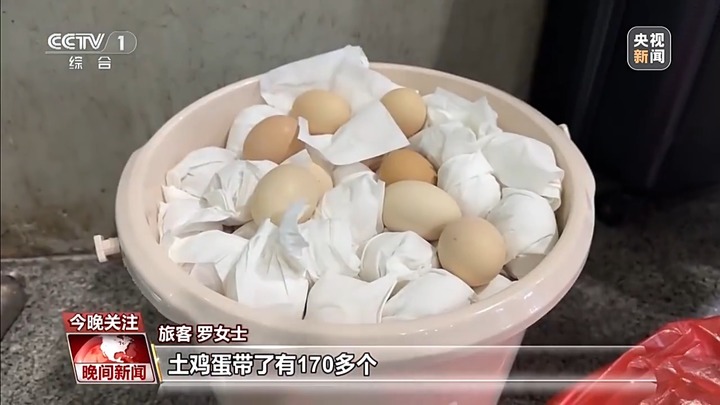 旅客 罗女士:土鸡蛋带了有170多个,给儿媳妇还有女儿,她们每一个拿点,她们都在成都上班。老家带过来的土鸡蛋,味道不一样,吃起来香嘛。
