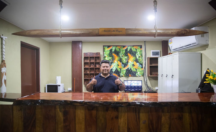 2月2日,在位于瑙鲁岛东南部的“阿夸里里”客栈内,客栈老板丹尼尔在向记者致意。新华社发(胡泾辰摄)