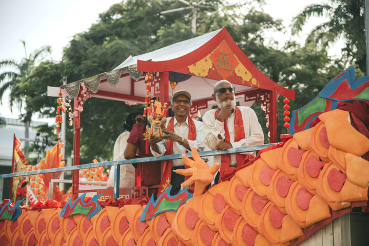 2月3日,在毛里求斯首都路易港,毛里求斯副总理胡斯努(左)参加花车巡游活动。新华社发(中国驻毛里求斯大使馆供图)