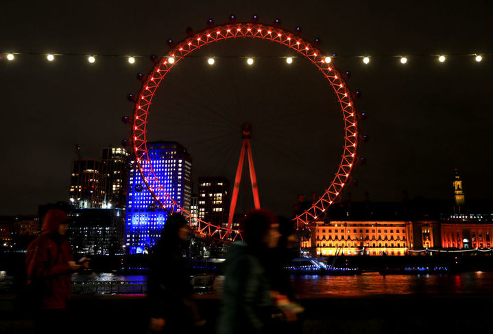 2月8日,在英国伦敦,行人走过亮起红色灯光的“伦敦眼”。新华社记者 李颖 摄