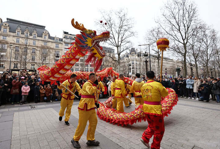 2月4日,人们在法国巴黎香榭丽舍大街观看舞龙舞狮表演。新华社记者 高静 摄
