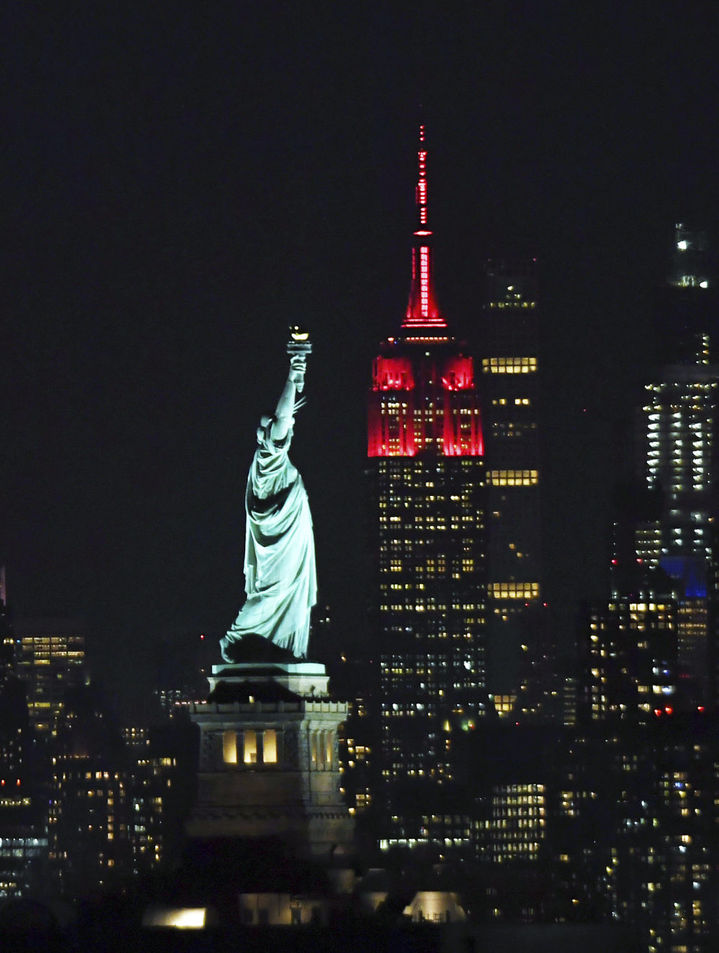 2月8日晚,美国纽约帝国大厦亮起中国春节主题灯光。新华社记者 李睿 摄