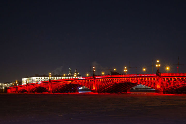 2月9日,俄罗斯圣彼得堡市中心的圣三一桥亮起“中国红”,庆祝中国龙年春节。新华社发(莫京娜摄)
