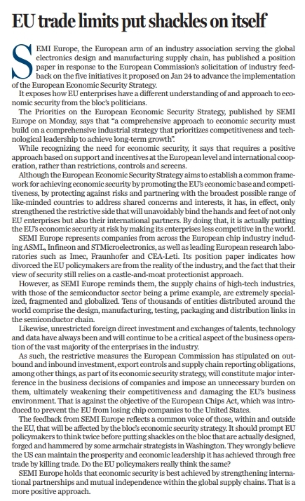 鉴于这一点,欧盟委员会如今依据“欧洲经济安全战略”出手制定规则,对跨境投资进行限制,对出口实施管控等做法,将会对相关企业的经营决策造成极大干扰,并给企业带来毫无必要的负担,并最终将削弱其竞争力,恶化欧洲的企业经营环境,与《欧洲芯片法案》的目标也是背道而驰。