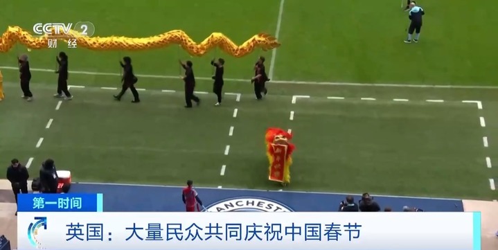 新春的气氛出现在英国的方方面面。在大年初一的英超足球比赛现场,曼城足球队主场迎战埃弗顿队。比赛前,球场边出现舞龙舞狮表演和武术表演,是全场数万名球迷一起庆祝新春的时刻。