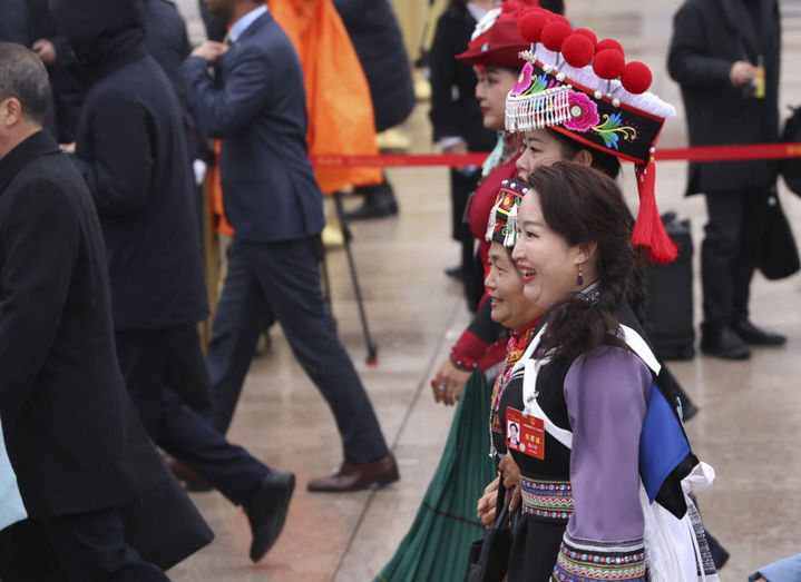 3月5日,岳巧云代表(前右一)走向人民大会堂,镜距准备参加十四届全国人大二次会议开幕会。两会离