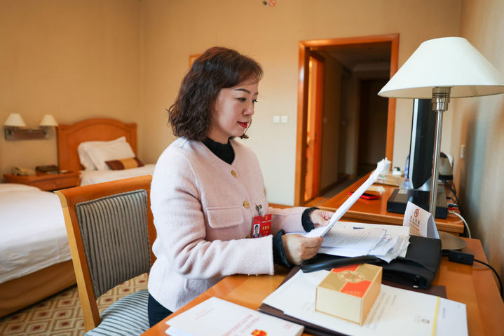 3月3日,王琼代表在湖北代表团驻地查看文件。